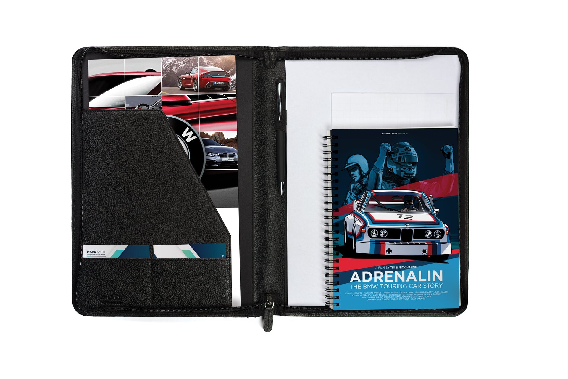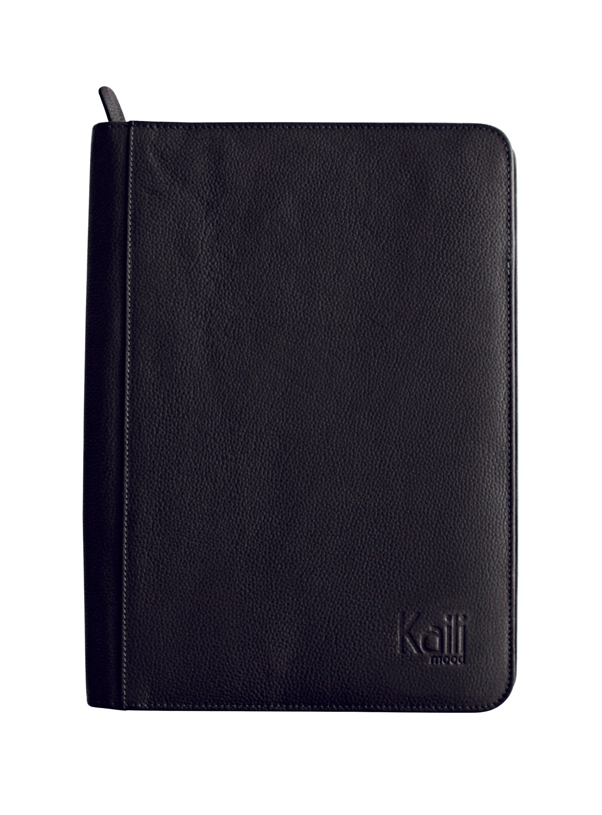 Portablocco con tasca per fogli formato A4 interamente realizzato in Vera Pelle. Tasca grande porta documenti 2 slot per biglietti da visita Anello elastico Porta Penna chiusura con lampo Colore Nero Dimensioni da chiuso: cm 24 x 32 x 2 Dimensioni da aperto cm 50 x 32 Confezionato in sacchetto TNT.