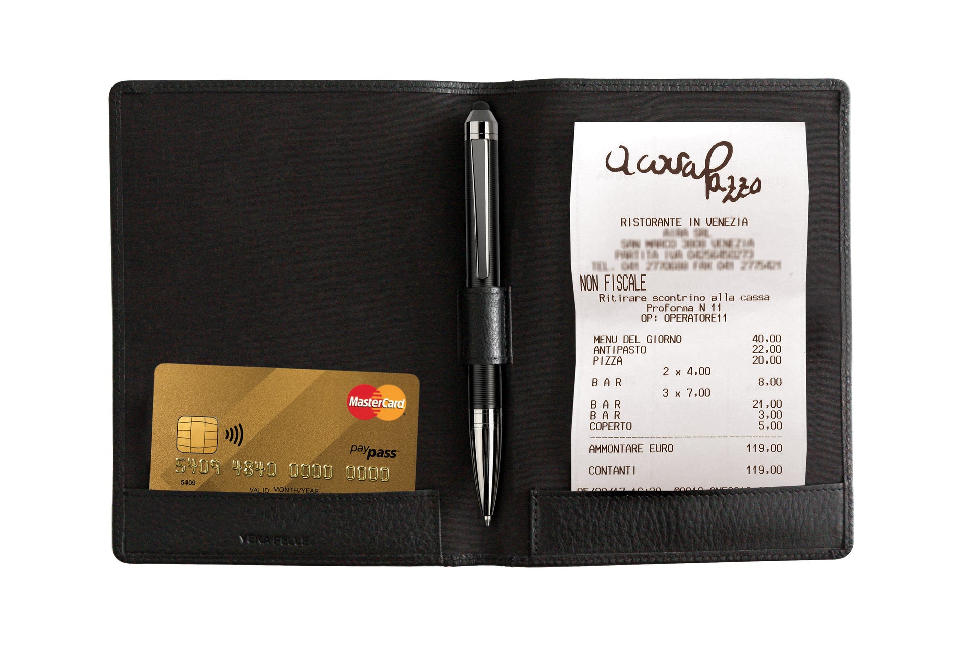 K0008AB | Porta Conto in Vera Pelle pieno fiore, grana dollaro. Mini slot interne e asola porta penna. Colore Nero. Dimensioni: cm 12 x 16 x 1.  Confezione: Sacchetto Tnt